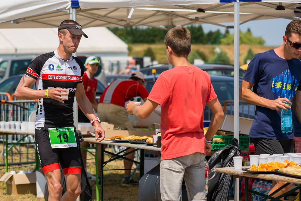 L’heure du départ approche, le stress monte un peu, la température aussi. J’enduis Ludo de crème solaire et le traîne au départ pour qu’il aille un peu s’échauffer avant son premier 10k. Je lui répète 1000 fois de ne sauter aucun ravito (surtout que l’orga en a prévu pas mal pour parer à la canicule) et de boire, boire, boire. On se dit qu’on se retrouvera au ravito 2 du vélo (où il faudra bien boire), à la sortie du ravito 1 de la CAP (où…devinez quoi, il pourra boire !) puis à l’arrivée (où il y a à boire..et à manger). Bref, Ludo prévoit de boire beaucoup avec cette chaleur.