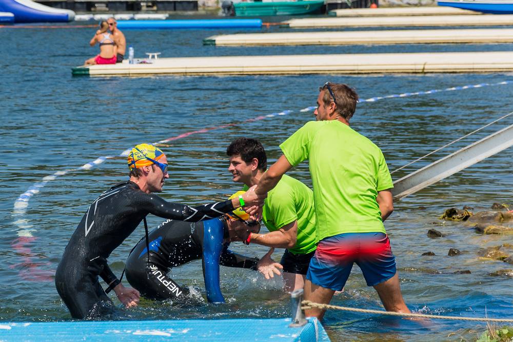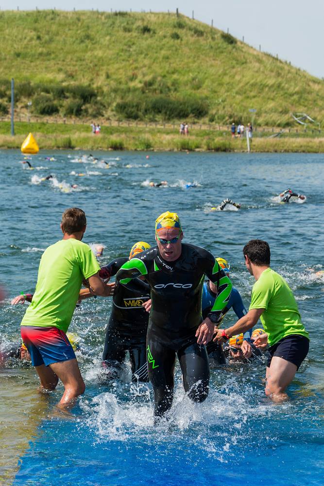 Je suis postée près de la sortie de la natation, pour voir l’arrivée des nageurs et surveiller la CAP 1 de mon duathlète. Ça part fort aussi dans son groupe, il y a du gros niveau !
