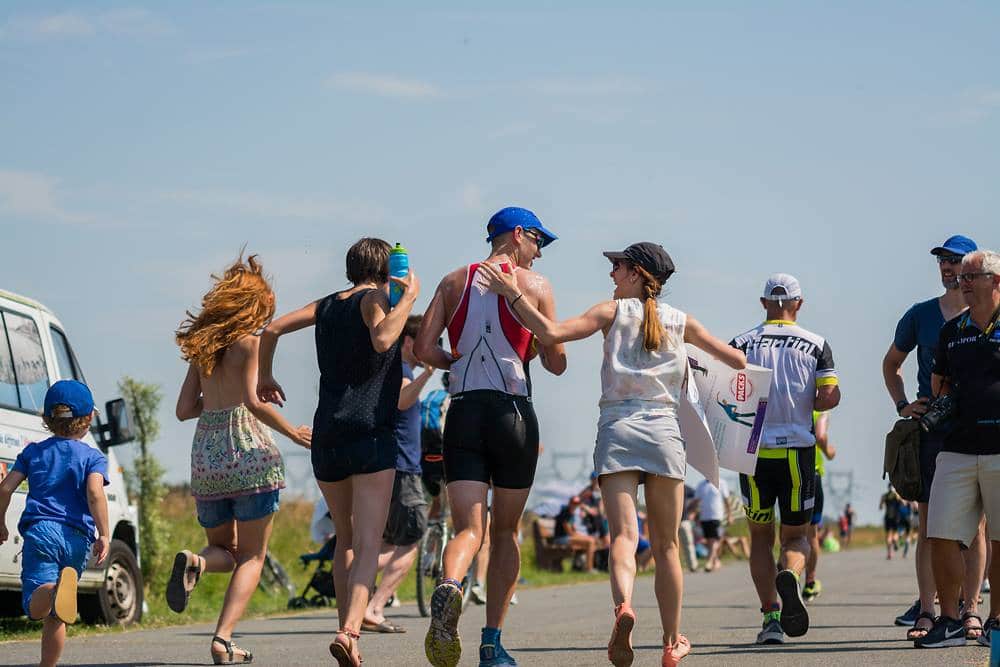 Autour de moi, des familles qui attendent qui un fiston, qui un papa ou plus rarement, une maman. En face, un groupe d’amies ont prévu des banderoles “Ironmen are sexy” pour leur pote Vincent. Comme moi, elles connaissent quelques faux départs avant de trouver Vincent, de l’asperger d’eau et de lui mettre de la musique. Il est chanceux, Vincent.
